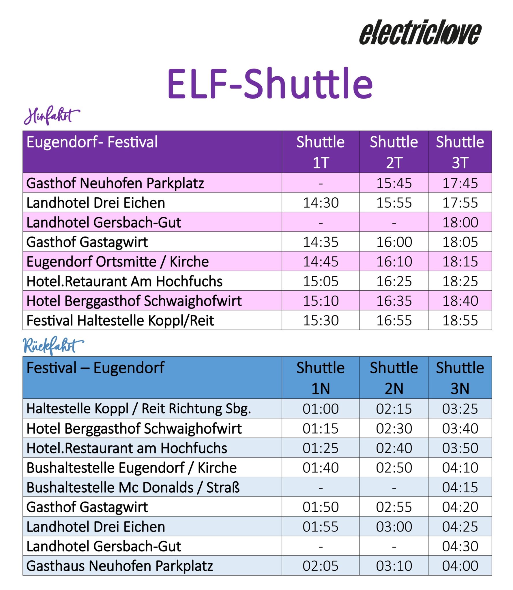 Der Shuttle-Service zwischen dem Electric Love Festival und Eugendorf ist weit mehr als nur ein Transportmittel – er macht den Festivalbesuch von Anfang an entspannt und unbeschwert. Vom Tourismusverband liebevoll organisiert, bringt er Übernachtungsgäste aus Eugendorf sicher und komfortabel direkt zum Festivalgelände und wieder zurück – ganz ohne Stress, Parkplatzsuche oder lange Wege. Ein fixer Fahrplan sorgt dabei für Verlässlichkeit, während Tickets ganz einfach vorab online erhältlich sind. Und das Beste: Auch Einheimische aus Eugendorf können diesen besonderen Service nutzen und sich ganz dem Electric Love Gefühl hingeben.